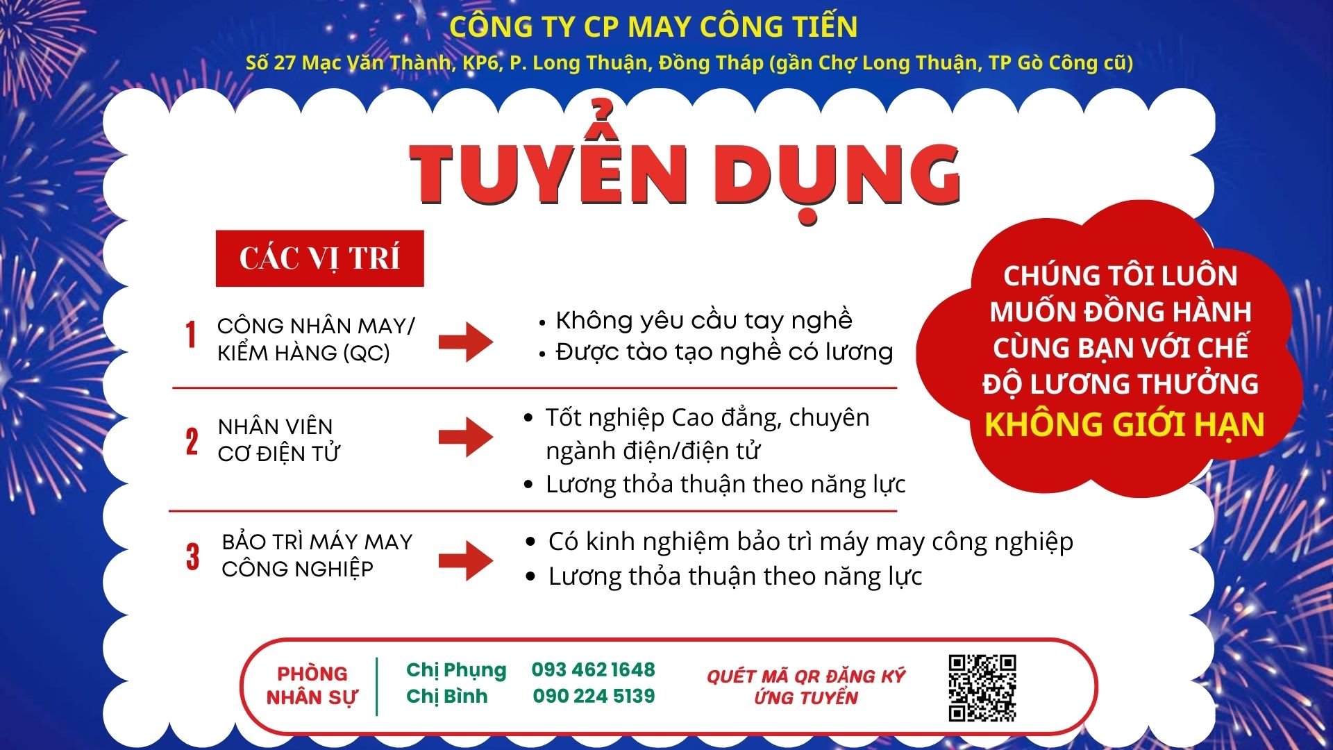 CÔNG TY MAY CÔNG TIẾN TUYỂN DỤNG BẢO TRÌ MÁY MAY CÔNG NGHIỆP: – Số lượng: 02 – Yêu cầu: có kinh nghiệm liên quan bảo trì máy/bảo trì máy may NHÂN VIÊN CƠ ĐIỆN: – Số lượng: 02 – Yêu cầu: Có kinh nghiệm hoặc tốt nghiệp chuyên ngành điện/điện công nghiệp, ưu tiên […]